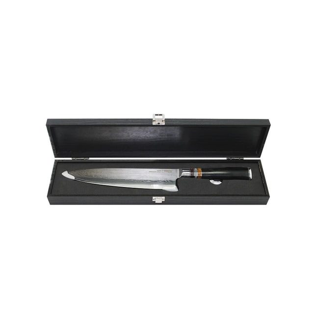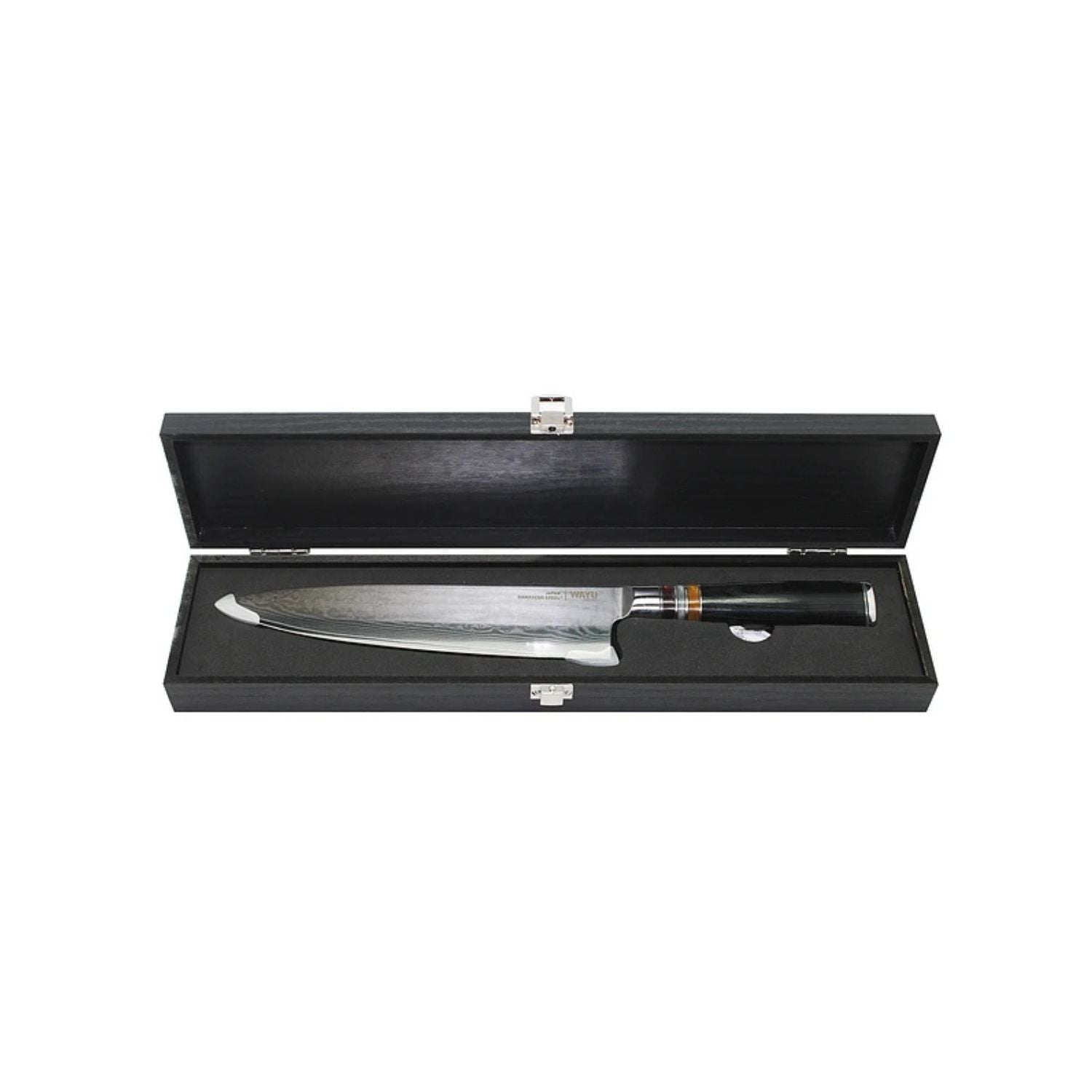 El Cuchillo Damascus Black Pakka Wayu Limited es ideal para una variedad de usos en la cocina. Su diseño y construcción lo hacen perfecto para cortar carne, picar verduras y realizar tareas de precisión en la preparación de alimentos. Gracias a su hoja afilada y su mango ergonómico, este cuchillo permite un manejo fácil y seguro, lo que lo convierte en una opción excelente tanto para chefs profesionales como para cocineros aficionados. Además, su presentación en caja de madera lo hace perfecto para regalar en ocasiones especiales, como bodas o aniversarios. Este cuchillo no solo es funcional, sino que también añade un toque de elegancia a cualquier cocina, convirtiéndose en una pieza central en la preparación de tus platillos favoritos.
