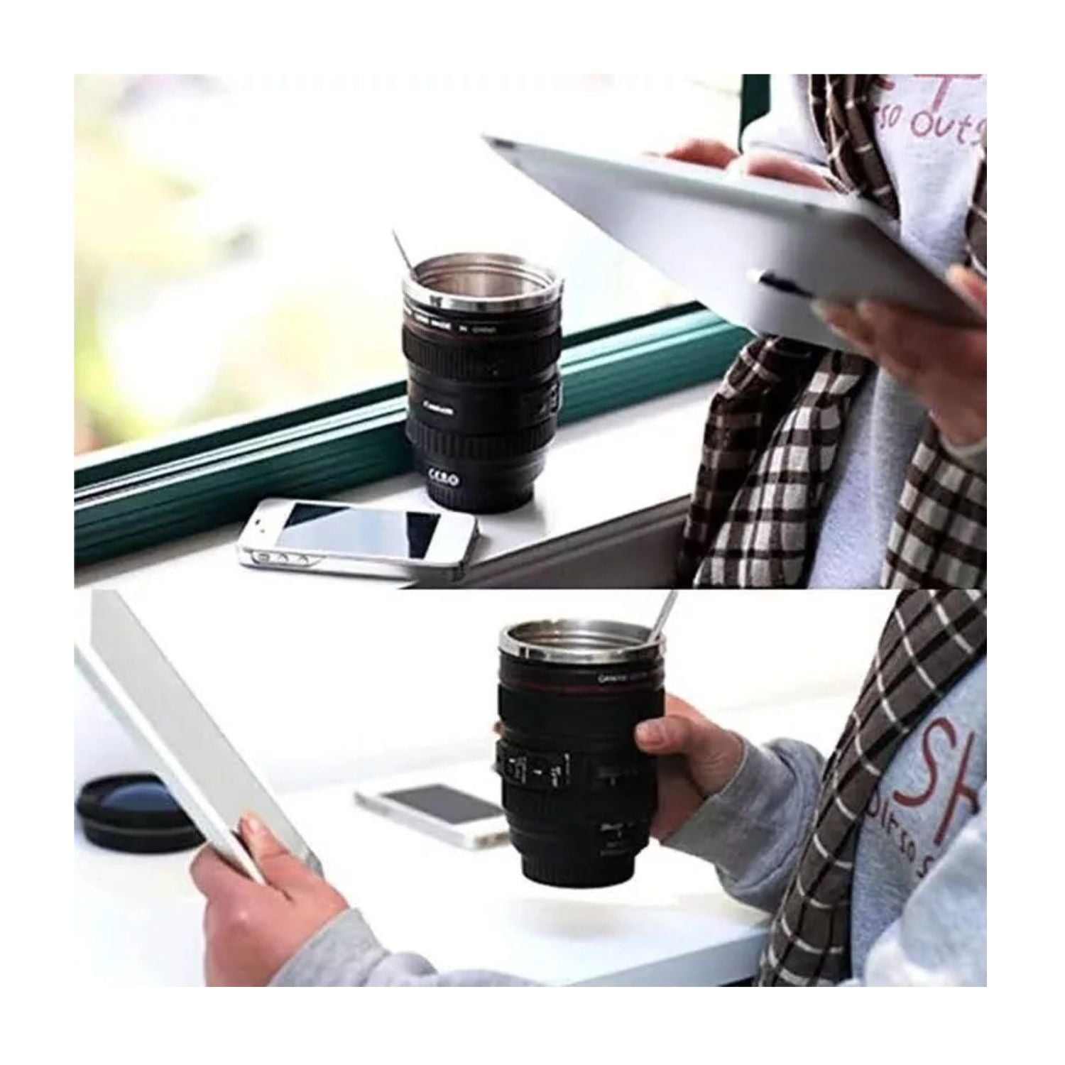 Vaso Cafe Camara Negro 14cm Con Tapa Diseño Moderno