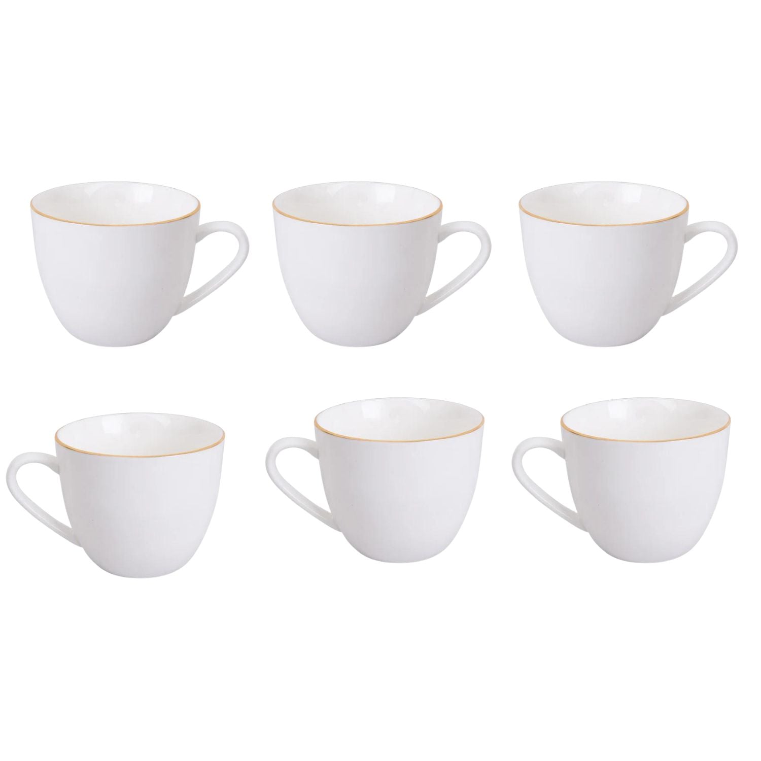 Este elegante set de 6 tazas de té está diseñado para añadir un toque de sofisticación a tu menaje de cocina. Cada taza está elaborada con porcelana de alta calidad y presenta un delicado borde dorado que resalta su diseño clásico y refinado. Con una capacidad de 260mL, estas tazas son perfectas para disfrutar de tu té favorito, ya sea en una reunión con amigos o en un momento de relajación personal. Su acabado brillante y su diseño atemporal las convierten en una adición imprescindible para cualquier hogar que valore la elegancia y el buen gusto.