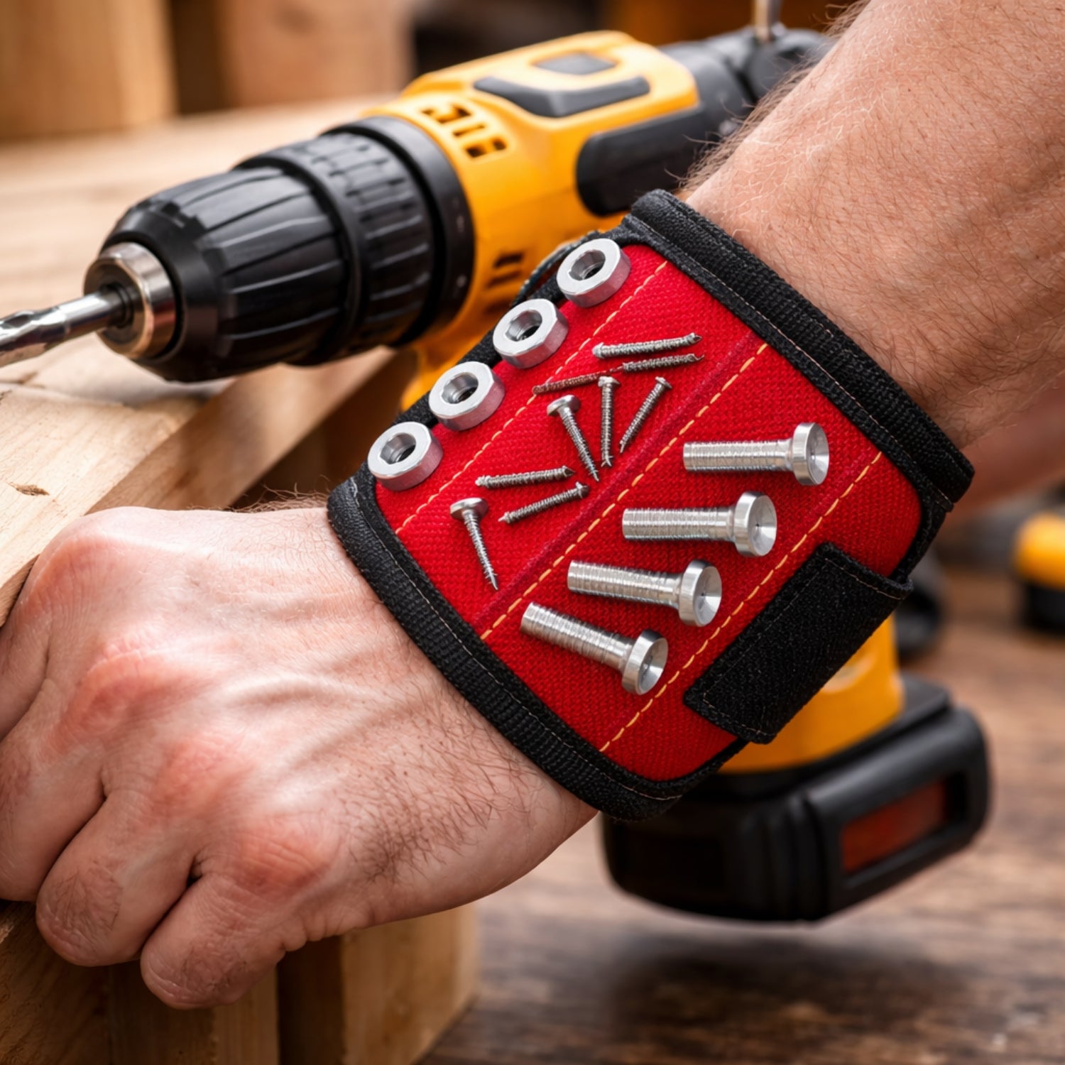 La pulsera magnética para herramientas es un accesorio práctico y funcional, diseñada para facilitar trabajos de bricolaje, carpintería, mecánica y mantenciones en general. Permite mantener tornillos, clavos, tuercas y piezas metálicas siempre a mano, optimizando el tiempo y mejorando la comodidad durante el trabajo.