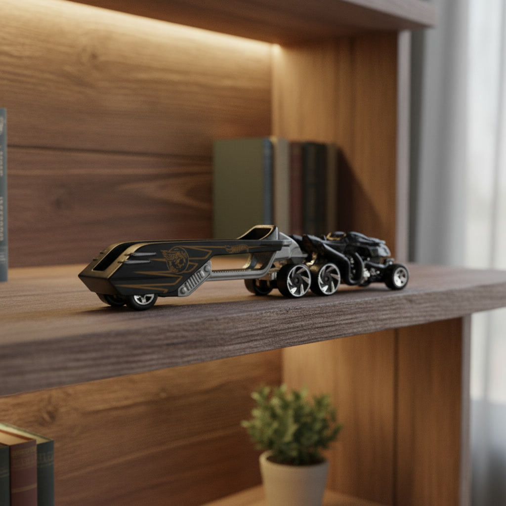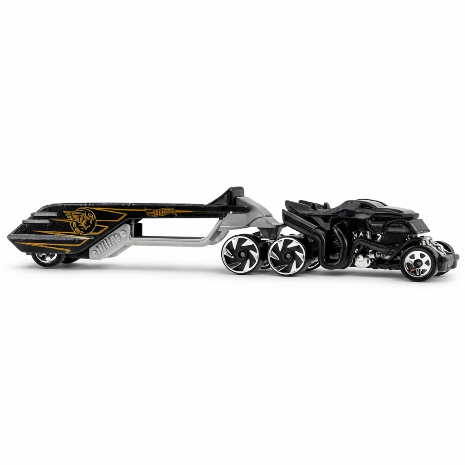 El Rad Rider Rig es parte de la exclusiva línea Track Fleet de Hot Wheels by Mattel. Este set incluye un camion semirremolque articulado y un auto deportivo die-cast escala 1:64, fabricados en metal fundido con acabados en negro cromado de alta calidad.