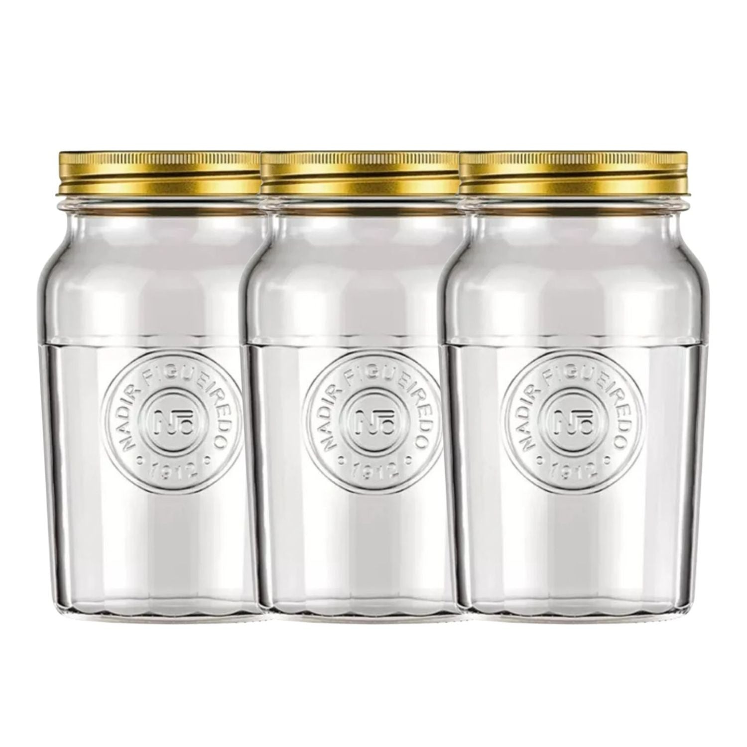 Set 3 Frascos Vintage de Vidrio 1500ml con Tapa Dorada