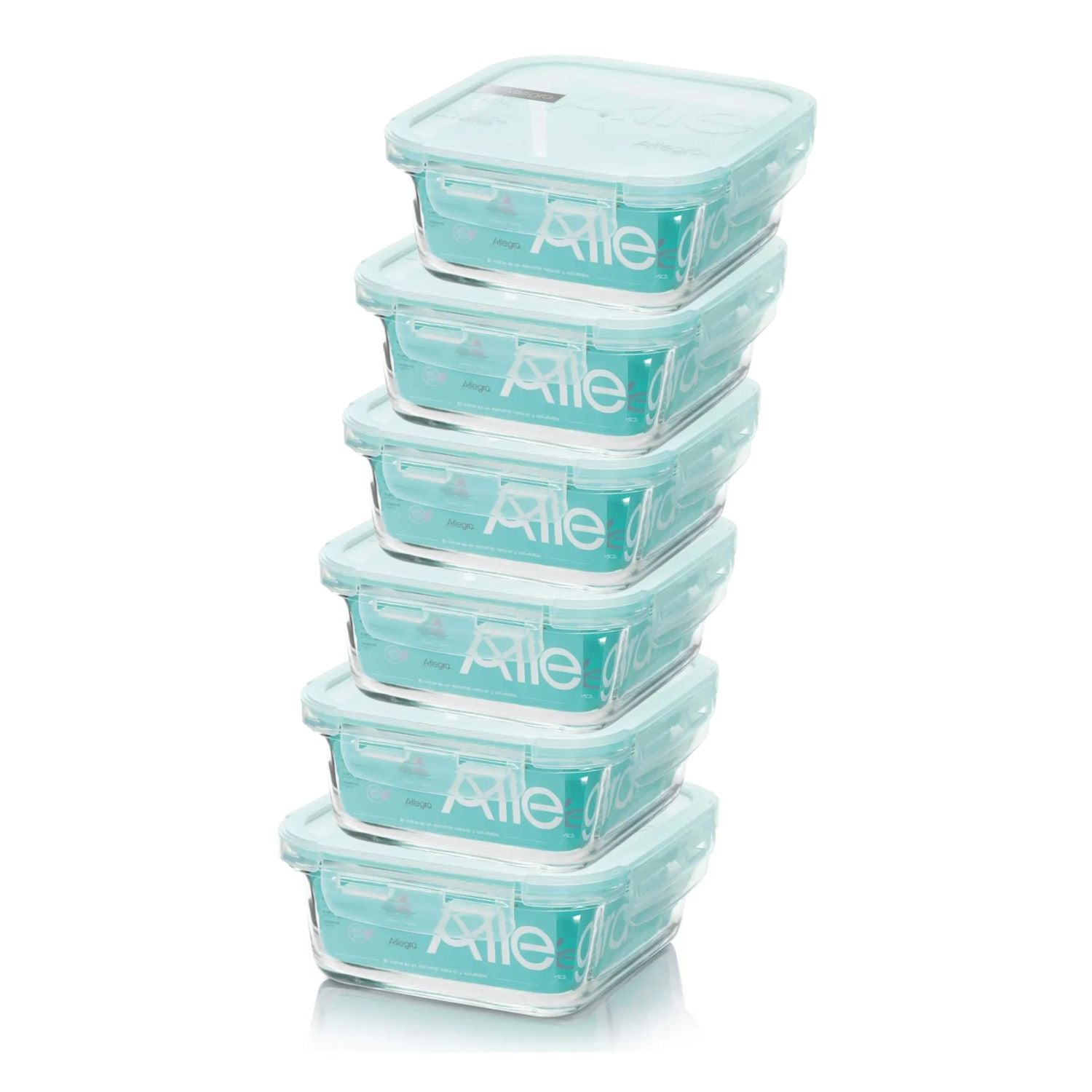 Set 6 Contenedores Hermetico Vidrio Cuadrado 380mL Allegra